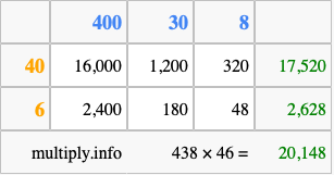 That's all there is to it! As you can see from the box above, the answer to 438 times 46 using the box method is 20,148.