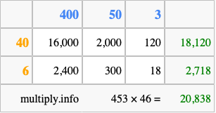 Finally, we add up all the sums we found in step 3 to get our final answer to 453 times 46.