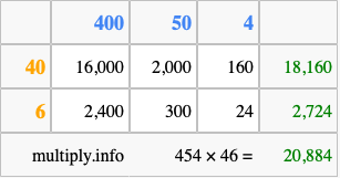 That's all there is to it! As you can see from the box above, the answer to 454 times 46 using the box method is 20,884.