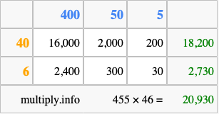 That's all there is to it! As you can see from the box above, the answer to 455 times 46 using the box method is 20,930.