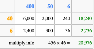 Finally, we add up all the sums we found in step 3 to get our final answer to 456 times 46.