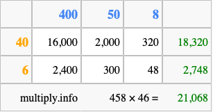 That's all there is to it! As you can see from the box above, the answer to 458 times 46 using the box method is 21,068.
