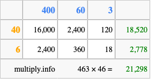 Finally, we add up all the sums we found in step 3 to get our final answer to 463 times 46.