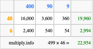 That's all there is to it! As you can see from the box above, the answer to 499 times 46 using the box method is 22,954.