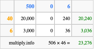 That's all there is to it! As you can see from the box above, the answer to 506 times 46 using the box method is 23,276.