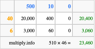 Below is an illustration showing you how to calculate 510 times 46 using the box method, using the instructions above.