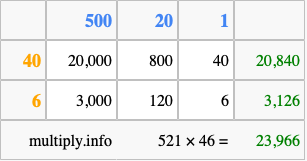 That's all there is to it! As you can see from the box above, the answer to 521 times 46 using the box method is 23,966.
