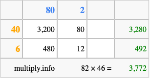 That's all there is to it! As you can see from the box above, the answer to 82 times 46 using the box method is 3,772.