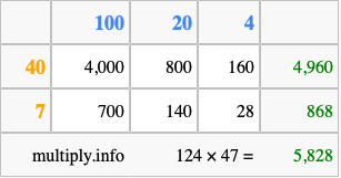Below is an illustration showing you how to calculate 124 times 47 using the box method, using the instructions above.