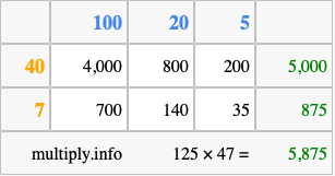 That's all there is to it! As you can see from the box above, the answer to 125 times 47 using the box method is 5,875.