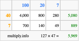 Finally, we add up all the sums we found in step 3 to get our final answer to 127 times 47.