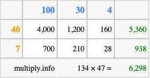 That's all there is to it! As you can see from the box above, the answer to 134 times 47 using the box method is 6,298.