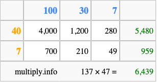 That's all there is to it! As you can see from the box above, the answer to 137 times 47 using the box method is 6,439.