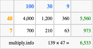 That's all there is to it! As you can see from the box above, the answer to 139 times 47 using the box method is 6,533.