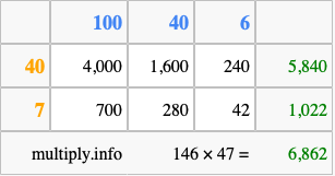 Finally, we add up all the sums we found in step 3 to get our final answer to 146 times 47.