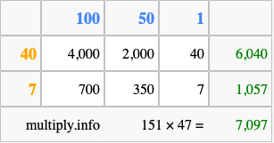Below is an illustration showing you how to calculate 151 times 47 using the box method, using the instructions above.