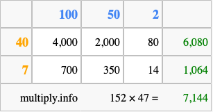Below is an illustration showing you how to calculate 152 times 47 using the box method, using the instructions above.