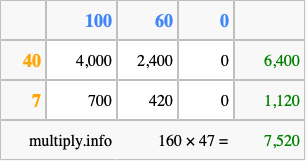Below is an illustration showing you how to calculate 160 times 47 using the box method, using the instructions above.