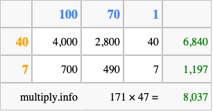Below is an illustration showing you how to calculate 171 times 47 using the box method, using the instructions above.