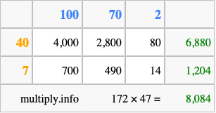 Below is an illustration showing you how to calculate 172 times 47 using the box method, using the instructions above.