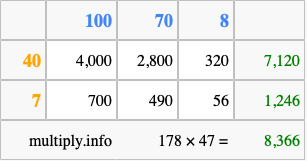 That's all there is to it! As you can see from the box above, the answer to 178 times 47 using the box method is 8,366.