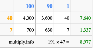 That's all there is to it! As you can see from the box above, the answer to 191 times 47 using the box method is 8,977.