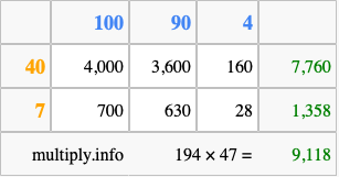Finally, we add up all the sums we found in step 3 to get our final answer to 194 times 47.