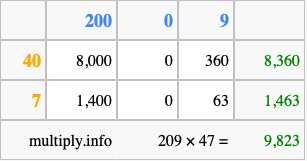 Below is an illustration showing you how to calculate 209 times 47 using the box method, using the instructions above.