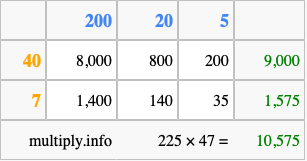 Finally, we add up all the sums we found in step 3 to get our final answer to 225 times 47.