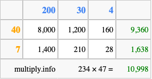 Finally, we add up all the sums we found in step 3 to get our final answer to 234 times 47.