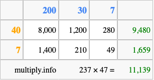 That's all there is to it! As you can see from the box above, the answer to 237 times 47 using the box method is 11,139.