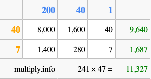 Below is an illustration showing you how to calculate 241 times 47 using the box method, using the instructions above.