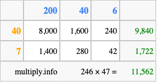 Finally, we add up all the sums we found in step 3 to get our final answer to 246 times 47.