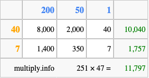Finally, we add up all the sums we found in step 3 to get our final answer to 251 times 47.