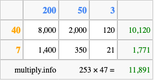 Finally, we add up all the sums we found in step 3 to get our final answer to 253 times 47.