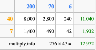 That's all there is to it! As you can see from the box above, the answer to 276 times 47 using the box method is 12,972.