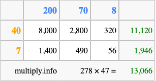 That's all there is to it! As you can see from the box above, the answer to 278 times 47 using the box method is 13,066.