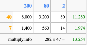 Finally, we add up all the sums we found in step 3 to get our final answer to 282 times 47.