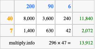 That's all there is to it! As you can see from the box above, the answer to 296 times 47 using the box method is 13,912.