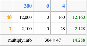 That's all there is to it! As you can see from the box above, the answer to 304 times 47 using the box method is 14,288.