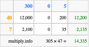 Below is an illustration showing you how to calculate 305 times 47 using the box method, using the instructions above.