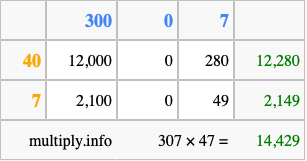 That's all there is to it! As you can see from the box above, the answer to 307 times 47 using the box method is 14,429.