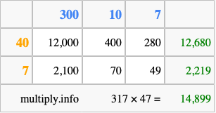Below is an illustration showing you how to calculate 317 times 47 using the box method, using the instructions above.