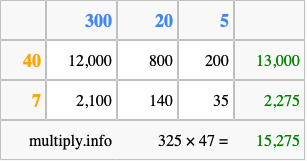 Below is an illustration showing you how to calculate 325 times 47 using the box method, using the instructions above.