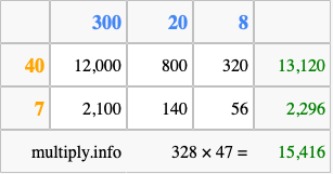 Below is an illustration showing you how to calculate 328 times 47 using the box method, using the instructions above.
