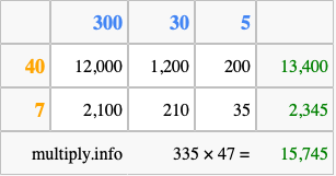 Finally, we add up all the sums we found in step 3 to get our final answer to 335 times 47.