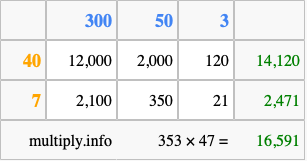 Finally, we add up all the sums we found in step 3 to get our final answer to 353 times 47.