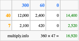That's all there is to it! As you can see from the box above, the answer to 360 times 47 using the box method is 16,920.