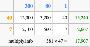 Finally, we add up all the sums we found in step 3 to get our final answer to 381 times 47.