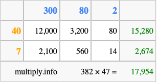 That's all there is to it! As you can see from the box above, the answer to 382 times 47 using the box method is 17,954.